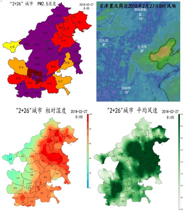 2018年2月26日起,京津冀及周邊地區(qū)經(jīng)歷了一次重污染過(guò)程,主要集中在河北南部、河南北部和山東西北部地區(qū),其中滄州、衡水、邢臺(tái)、邯鄲、安陽(yáng)等城市污染較嚴(yán)重。截止2月27日8時(shí),京津冀及周邊地區(qū)“2+26”城市有23個(gè)城市PM2.5小時(shí)濃度先后超過(guò)150微克/立方米(日均值重污染標(biāo)準(zhǔn));其中,有5個(gè)城市PM2.5小時(shí)濃度超過(guò)250微克/立方米(日均值嚴(yán)重污染標(biāo)準(zhǔn))。區(qū)域內(nèi)PM2.5小時(shí)濃度最高值出現(xiàn)在安陽(yáng),2月27日7時(shí)達(dá)到408微克/立方米;北京市PM2.5小時(shí)濃度過(guò)程高值同樣出現(xiàn)在2月27日7時(shí),達(dá)到215微克/立方米(圖1)。