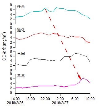 本次重污染過(guò)程中,從唐山到北京一線的CO濃度伴隨PM2.5存在明顯的快速增加,北京2月27日4時(shí)之前CO維持在2.2-2.3 mg/m3,5-9時(shí)迅速上升至2.6-4.4 mg/m3。從遷西-遵化-玉田-平谷(沿主導(dǎo)風(fēng)向)各監(jiān)測(cè)點(diǎn)位的時(shí)序變化也可以看出,CO沿傳輸方向峰值明顯呈依次出現(xiàn)的特征。污染物特征雷達(dá)圖也顯示,北京在此次污染過(guò)程中CO呈現(xiàn)相對(duì)很高的特征。以上證據(jù)表明,北京市的污染明顯受到了來(lái)自東部地區(qū)的傳輸影響(圖5)。