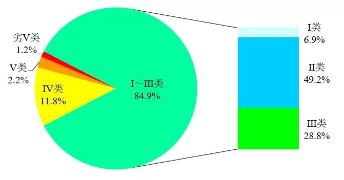 1-12月,3641個國家地表水考核斷面中,水質優良(Ⅰ~Ⅲ類)斷面比例為84.9%,與2020年相比上升1.5個百分點;劣Ⅴ類斷面比例為1.2%,均達到2021年水質目標要求。主要污染指標為化學需氧量、高錳酸鹽指數和總磷。