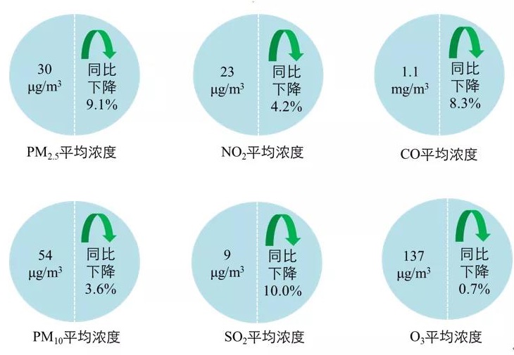 1-12月,全國339個地級及以上城市平均優良天數比例為87.5%,同比上升0.5個百分點;PM2.5平均濃度為30微克/立方米,同比下降9.1%;PM10平均濃度為54微克/立方米,同比下降3.6%;O3平均濃度為137微克/立方米,同比下降0.7%;SO2平均濃度為9微克/立方米,同比下降10.0%;NO2平均濃度為23微克/立方米,同比下降4.2%;CO平均濃度為1.1毫克/立方米,同比下降8.3%。