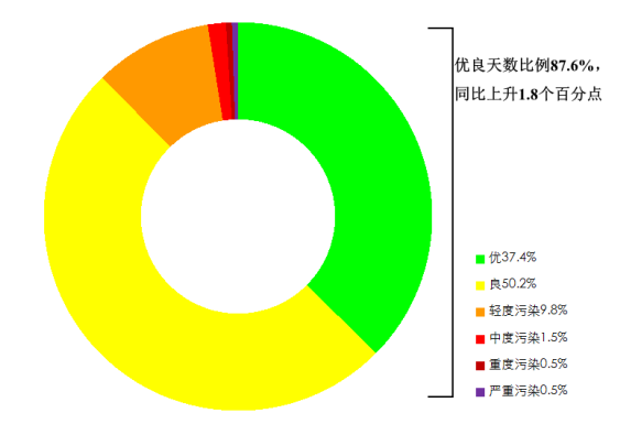 1—9月,全國(guó)339個(gè)地級(jí)及以上城市平均空氣質(zhì)量?jī)?yōu)良天數(shù)比例為87.6%,同比上升1.8個(gè)百分點(diǎn);平均重度及以上污染天數(shù)比例為1.1%,同比持平。由沙塵天氣導(dǎo)致的平均超標(biāo)天數(shù)比例為3.1%,其中重度及以上污染天數(shù)比例為0.7%。
