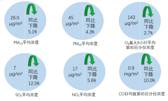 1—9月,全國(guó)339個(gè)地級(jí)及以上城市PM2.5平均濃度為26.0微克/立方米,同比下降5.1%;PM10平均濃度為45微克/立方米,同比下降4.3%;O3平均濃度為143微克/立方米,同比下降2.7%;SO2平均濃度為7微克/立方米,同比下降12.5%;NO2平均濃度為17微克/立方米,同比下降5.6%;CO平均濃度為0.9毫克/立方米,同比下降10.0%。
